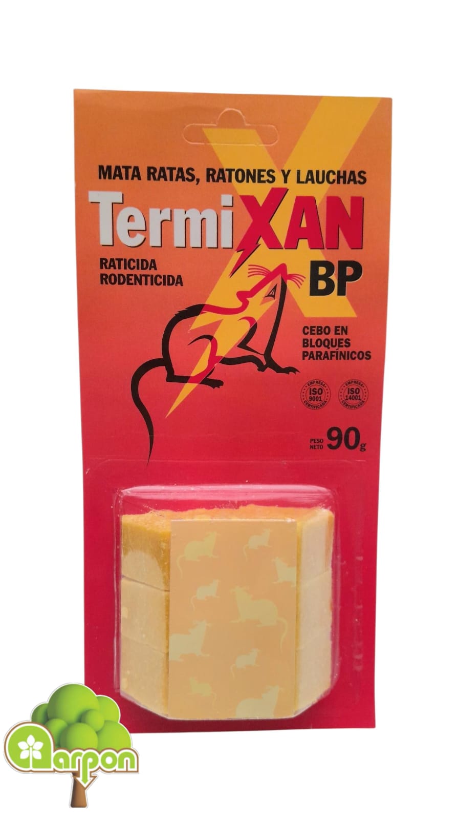 Raticida Termixan BP en bloques parafinados de 90 g. Alta resistencia a humedad y gran poder de atracción para control efectivo de roedores.